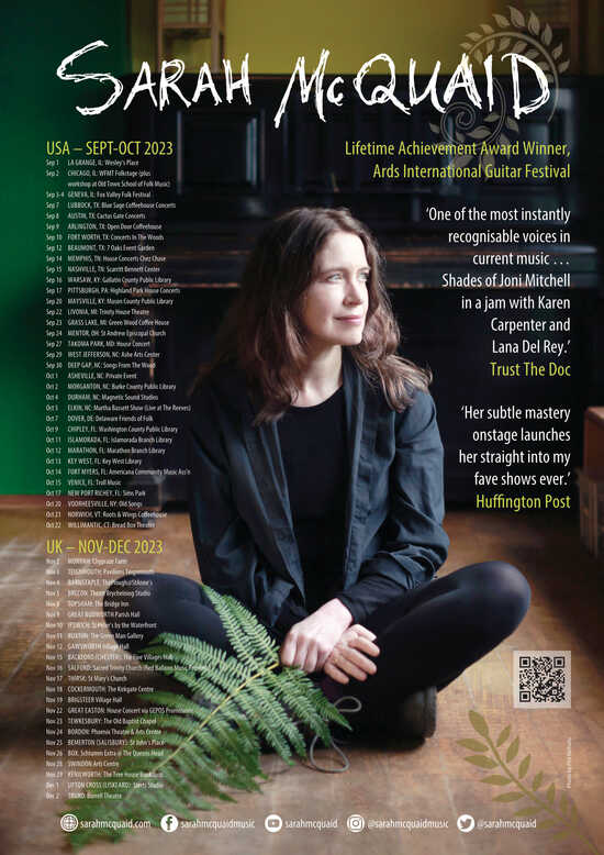 Sarah McQuaid’s lush, chocolatey voice combines with her engaging personality, “subtle mastery onstage” (Huffington Post) and “brilliant musicianship” (fRoots) on acoustic and electric guitars, piano and (occasionally) drum to create a truly immersive experience.